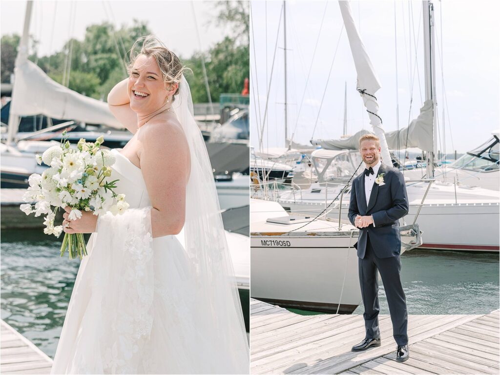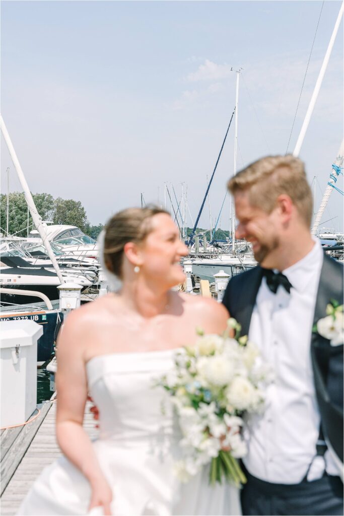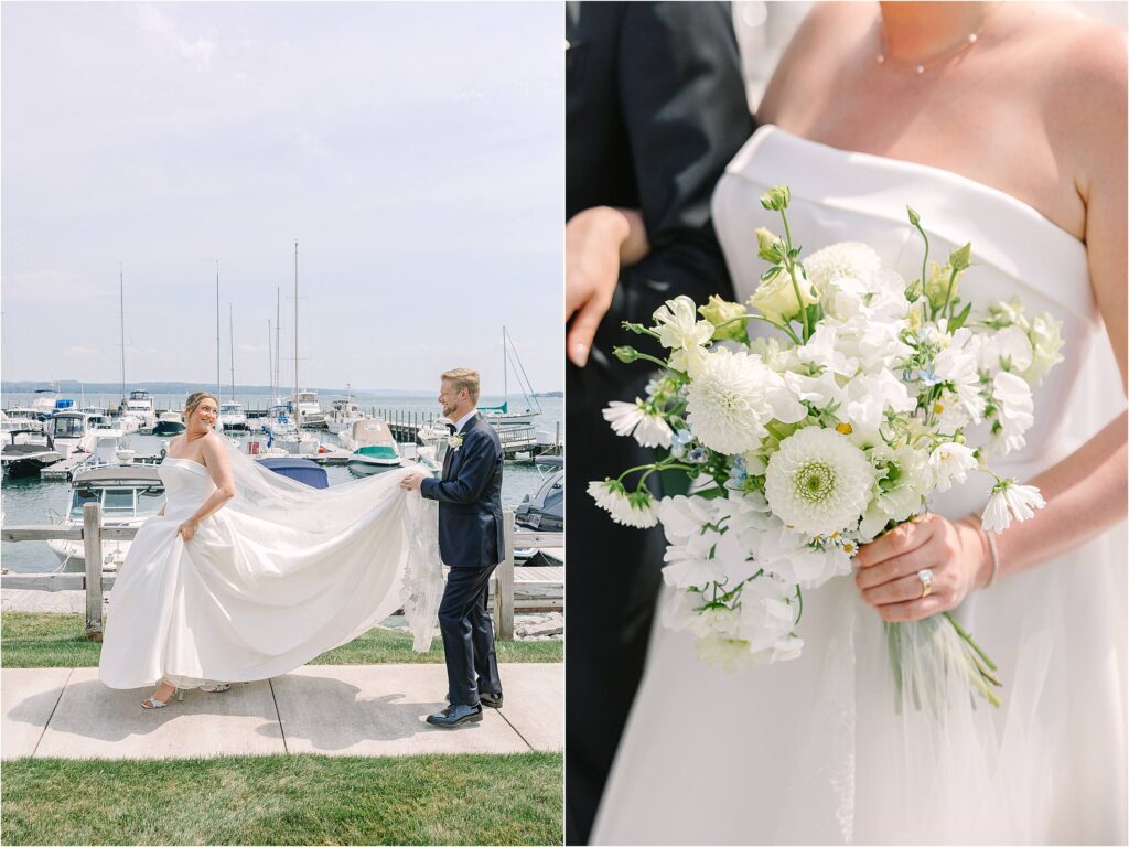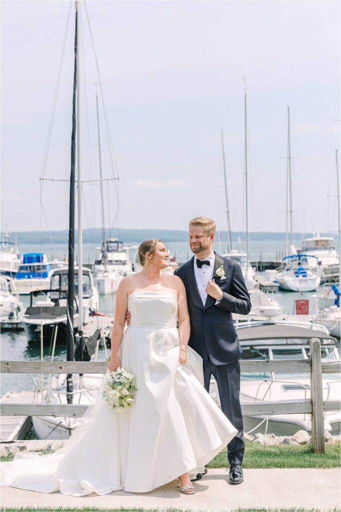 The setting for this Charlevoix Yacht Club wedding could not have been more perfect. The water on Lake Charlevoix was that unmistakable shade of summer blue—bright, expansive, and calm all at once. Sailboats lined the marina, creating a naturally editorial backdrop that felt both elevated and distinctly Northern Michigan.